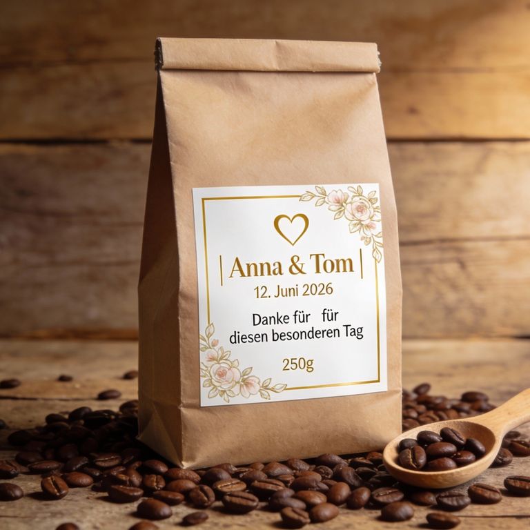 Überrascht eure Hochzeitsgäste mit kleinen Kaffeetüten aus unserer Rösterei – mit individuell gestaltetem Etikett (z. B. mit euren Namen, Hochzeitsdatum oder persönlicher Botschaft). Ein besonderes Dankeschön zum Mitnehmen.
